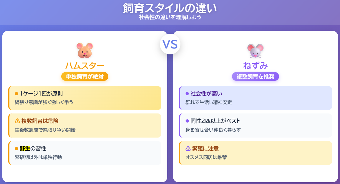 ジャンガリアンハムスターなど一部のドワーフ種は、相性次第で複数飼育が「可能」とされることもありますが、それは非常に広いケージ、複数の隠れ家や給水器、回し車を用意し、飼い主さんが常時監視できるなど、極めて高度な管理下での話です。基本的にはケンカが始まればすぐに別居させる必要があり、初心者の方には全くおすすめできません。
