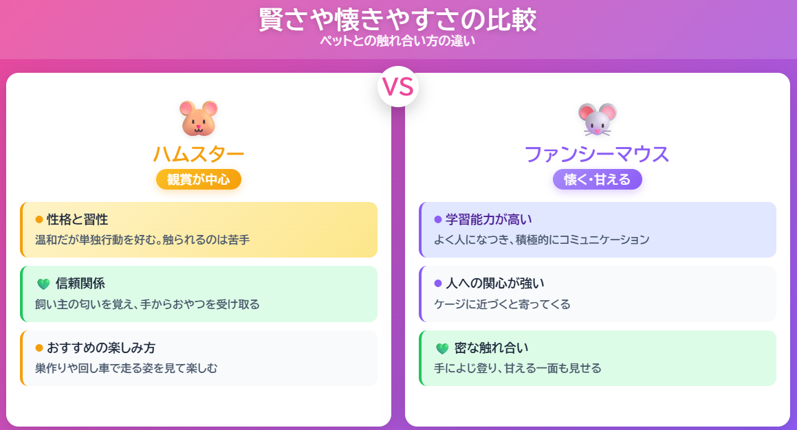 ファンシーマウスは、「学習能力が高く、よく人になつく」とされています。ハムスターよりも人への関心が強く、ケージに近づくと寄ってきたり、手によじ登ってきたりと、積極的なコミュニケーションが可能です。飼い主さんに「甘える一面」も見せることがあり、ハムスターよりも密な触れ合いを求める方に向いているかもしれません。
